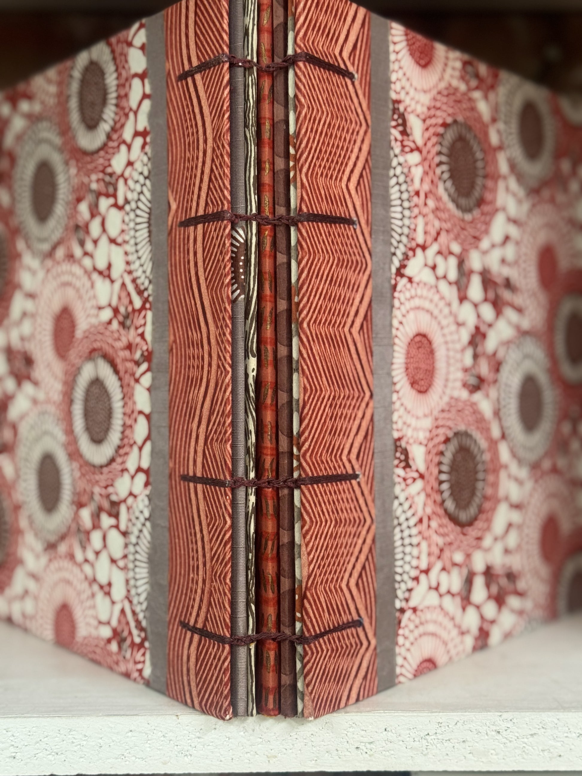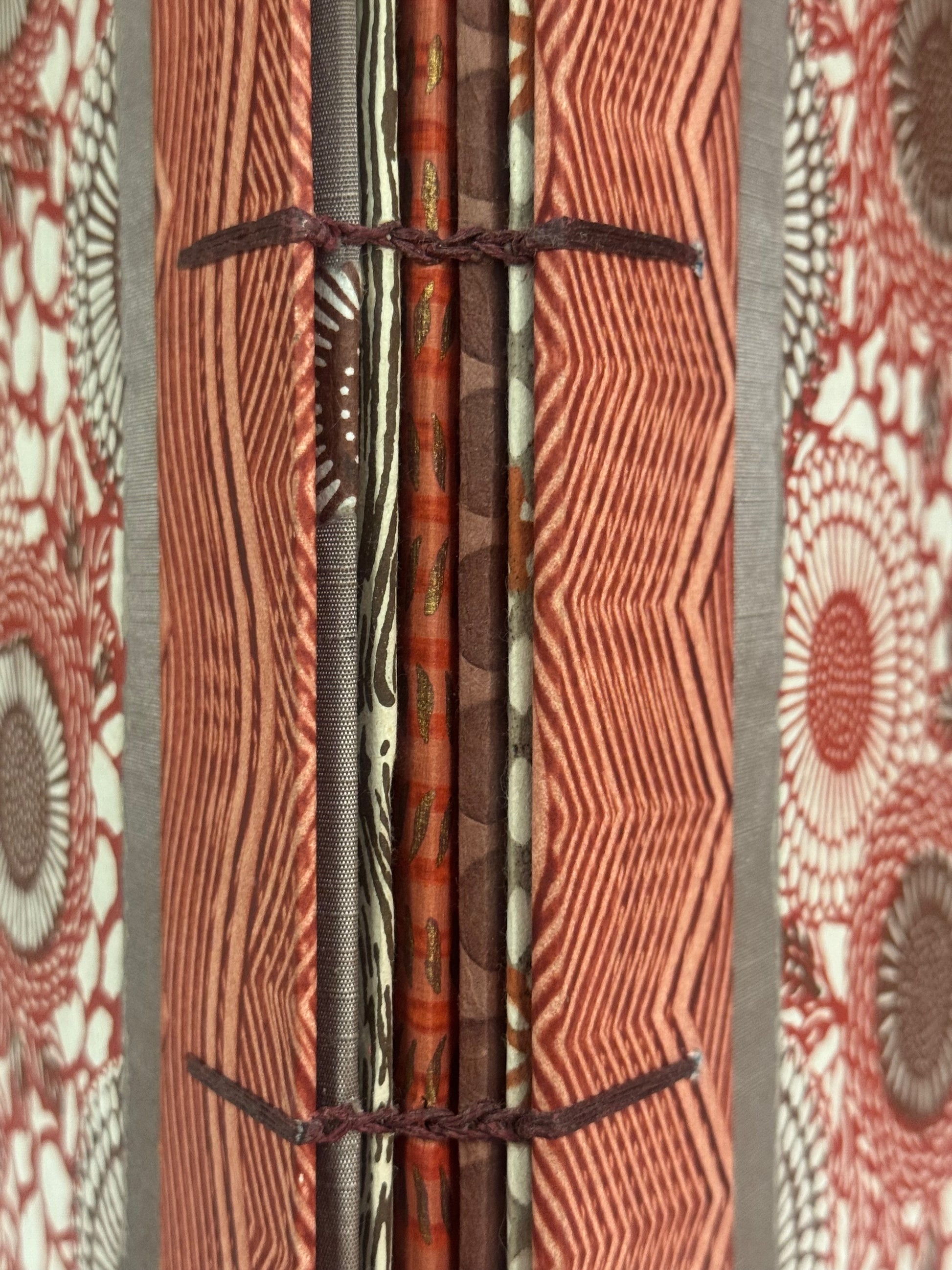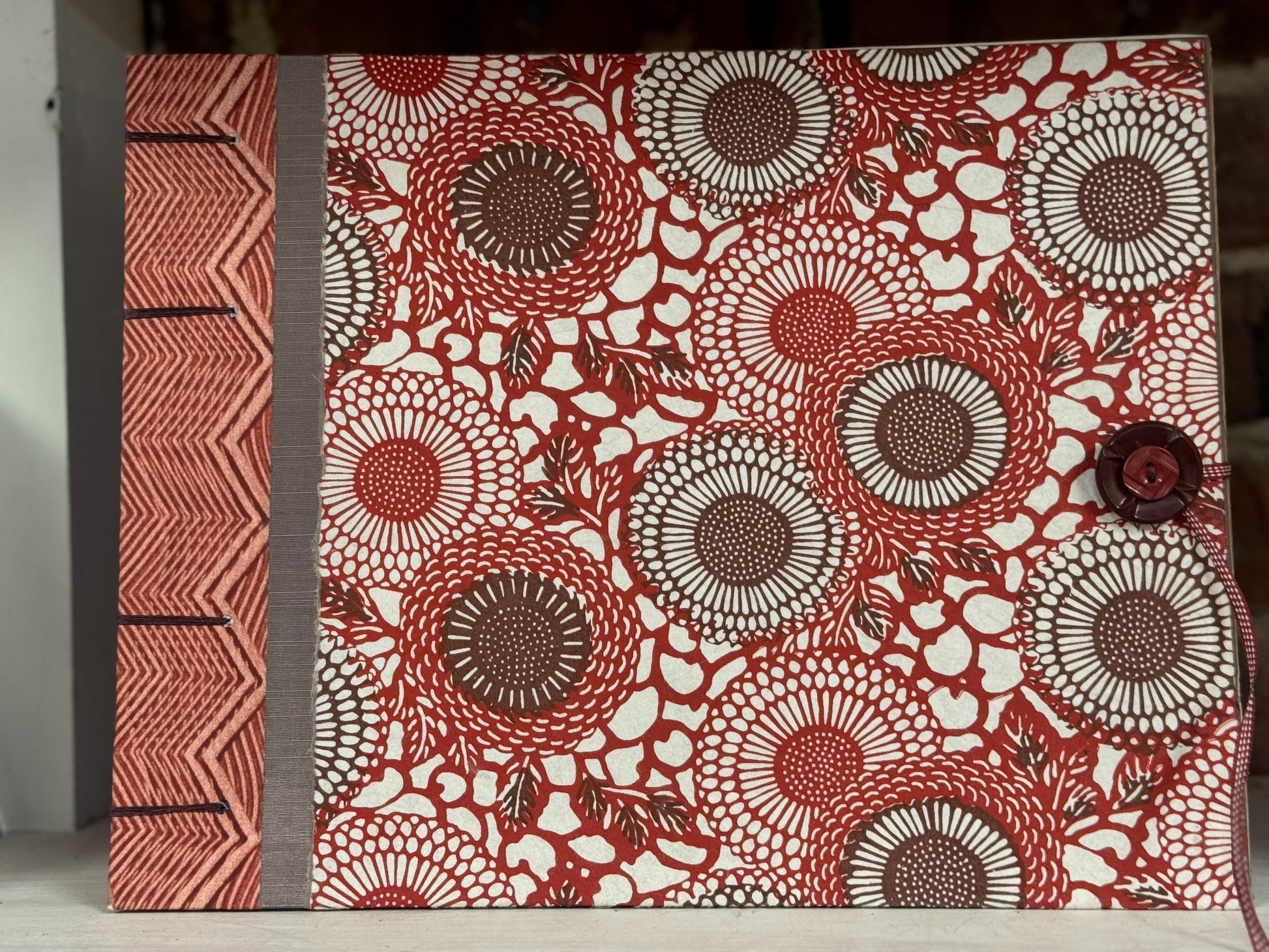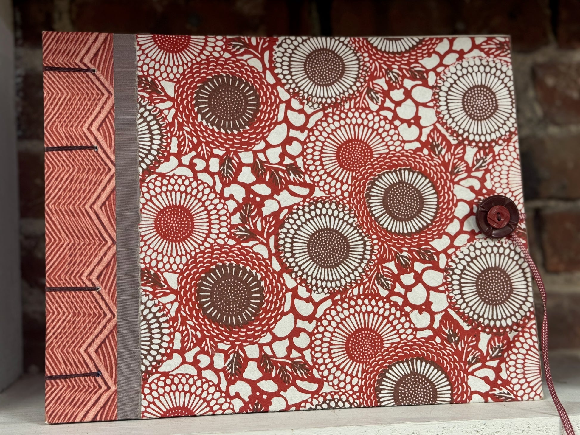A custom, handbound album crafted with layers of history and texture. The cover pairs bold Japanese and Italian decorative papers in shades of deep red, brown, and taupe, while the exposed spine reveals hand-sewn signatures bound in waxed linen thread. Finished with a vintage red button closure, it feels both timeless and personal — a true modern heirloom.