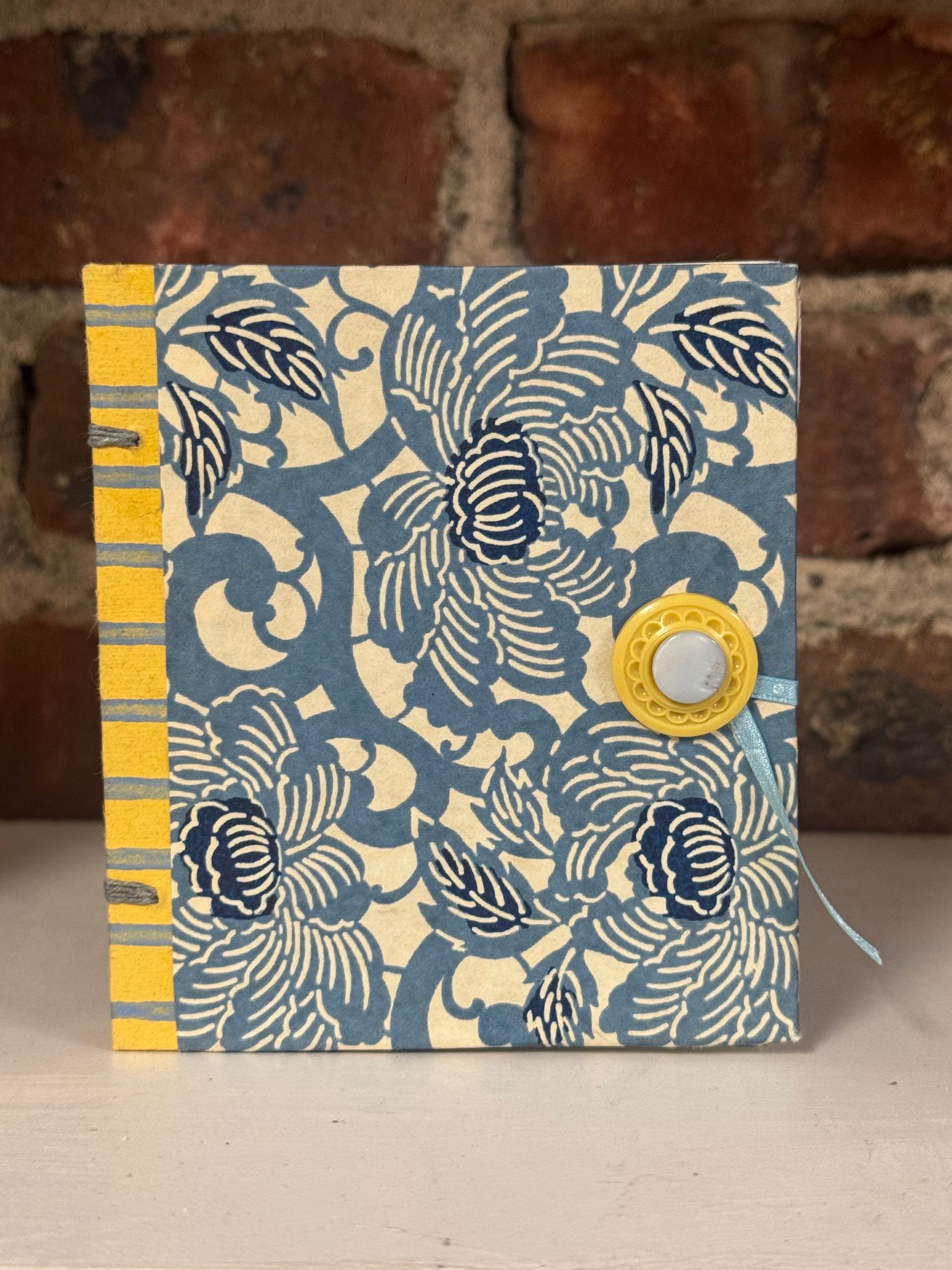 A one-of-a-kind handmade artist book bound with letterpressed floral paper in soft blue and cream, accented by a sunny yellow spine and matching button closure. Each page inside is a mix of handmade and vintage papers, stitched by hand with visible binding. Small enough to hold in one hand (about 6x6 inches), it’s part journal, part art object — perfect for writing, sketching, or display.
