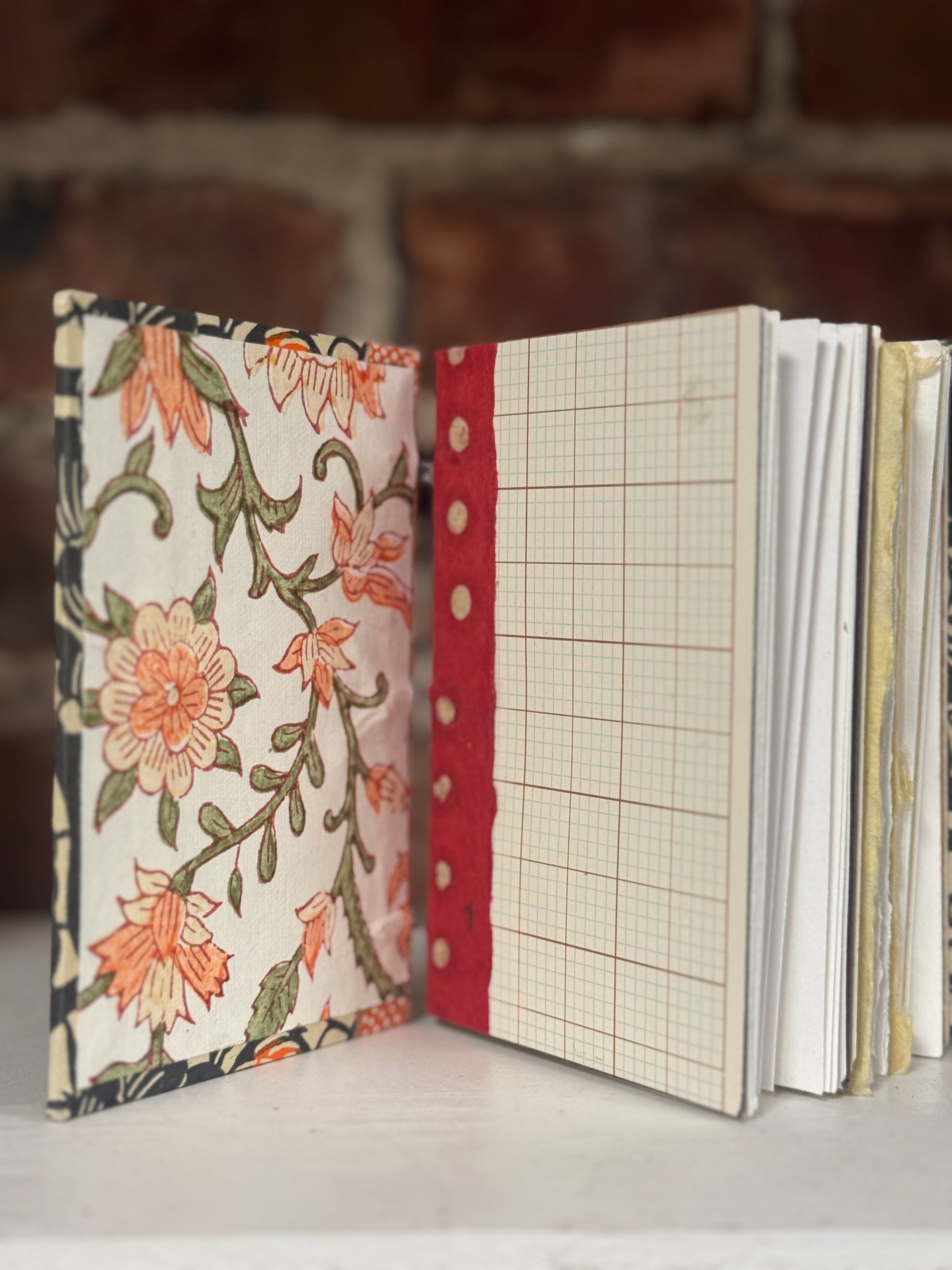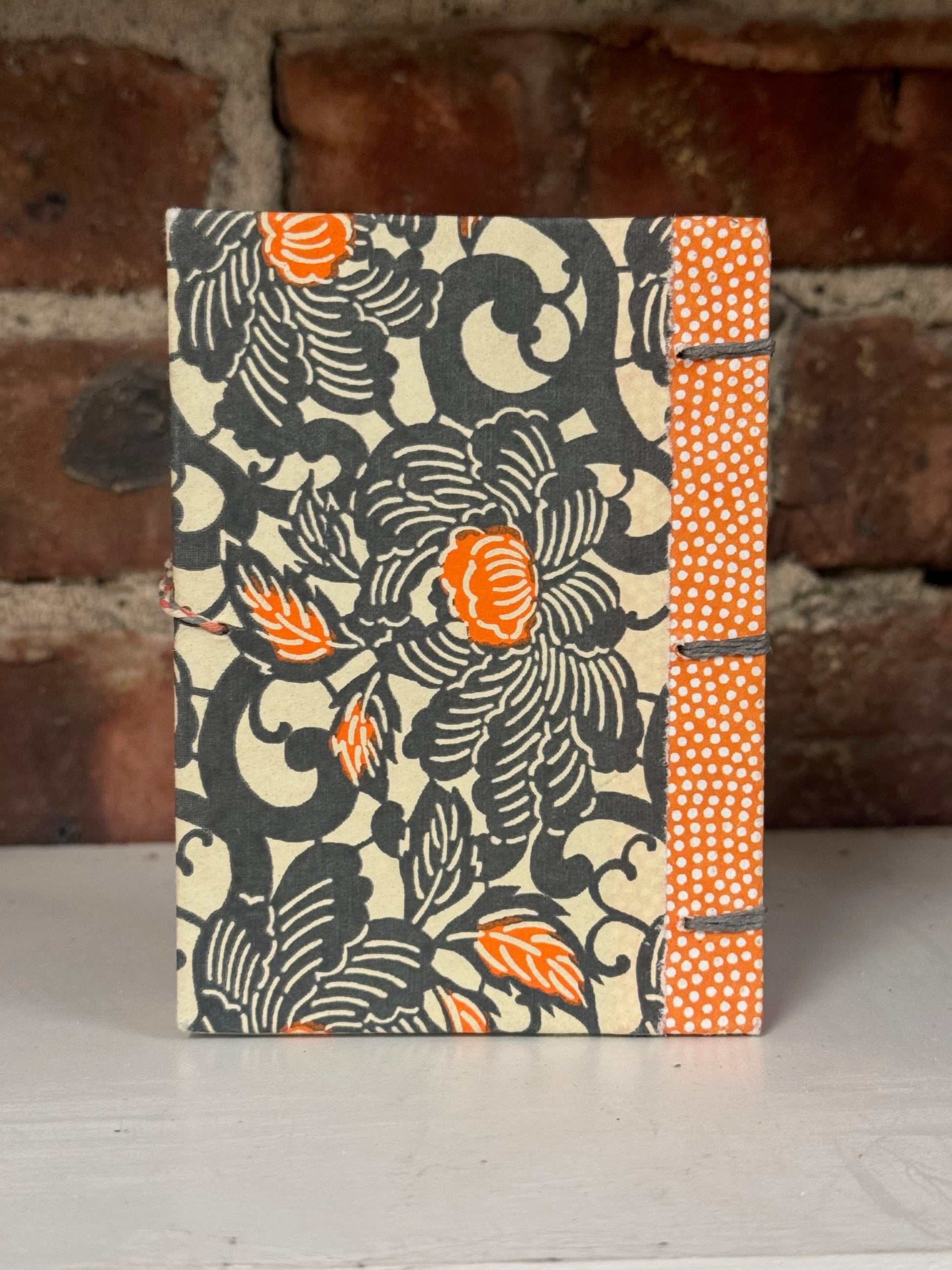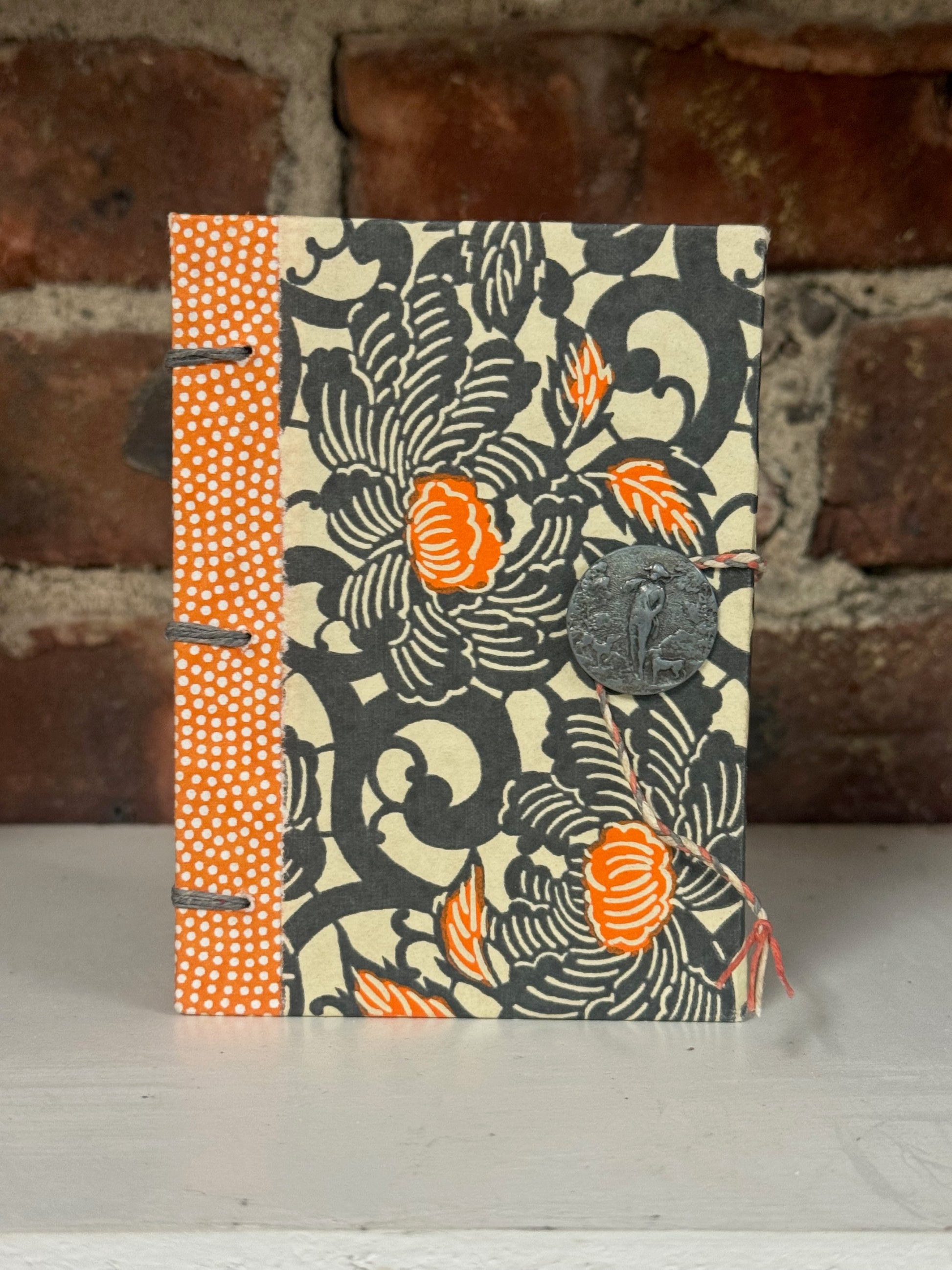 A handmade artist book with floral paper in charcoal, cream, and orange, stitched with visible exposed spine binding. The cover features a vintage metal button closure, paired with fine twine in soft orange tones. Inside, a mix of handmade and vintage papers creates a layered, tactile experience — every page unique. A striking blend of craftsmanship, color, and material — part journal, part art object.
