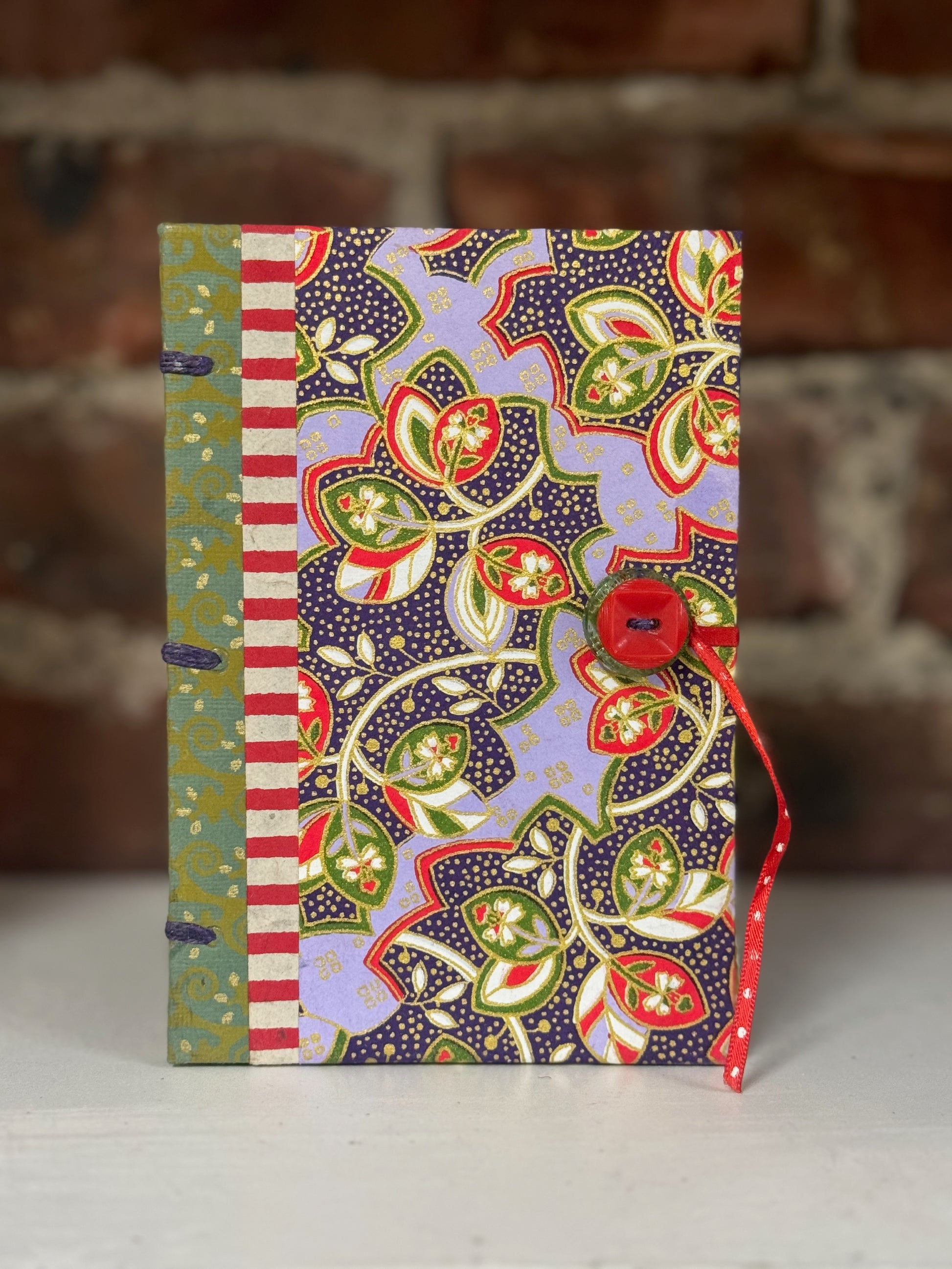 A hand-bound artist book wrapped in vintage floral paper — deep plum, soft lavender, and warm green, with little sparks of red. The spine is fully exposed (because good work deserves to be seen) and stitched with rich violet thread. A vintage red button and ribbon finish the closure — practical, a little flirtatious.
