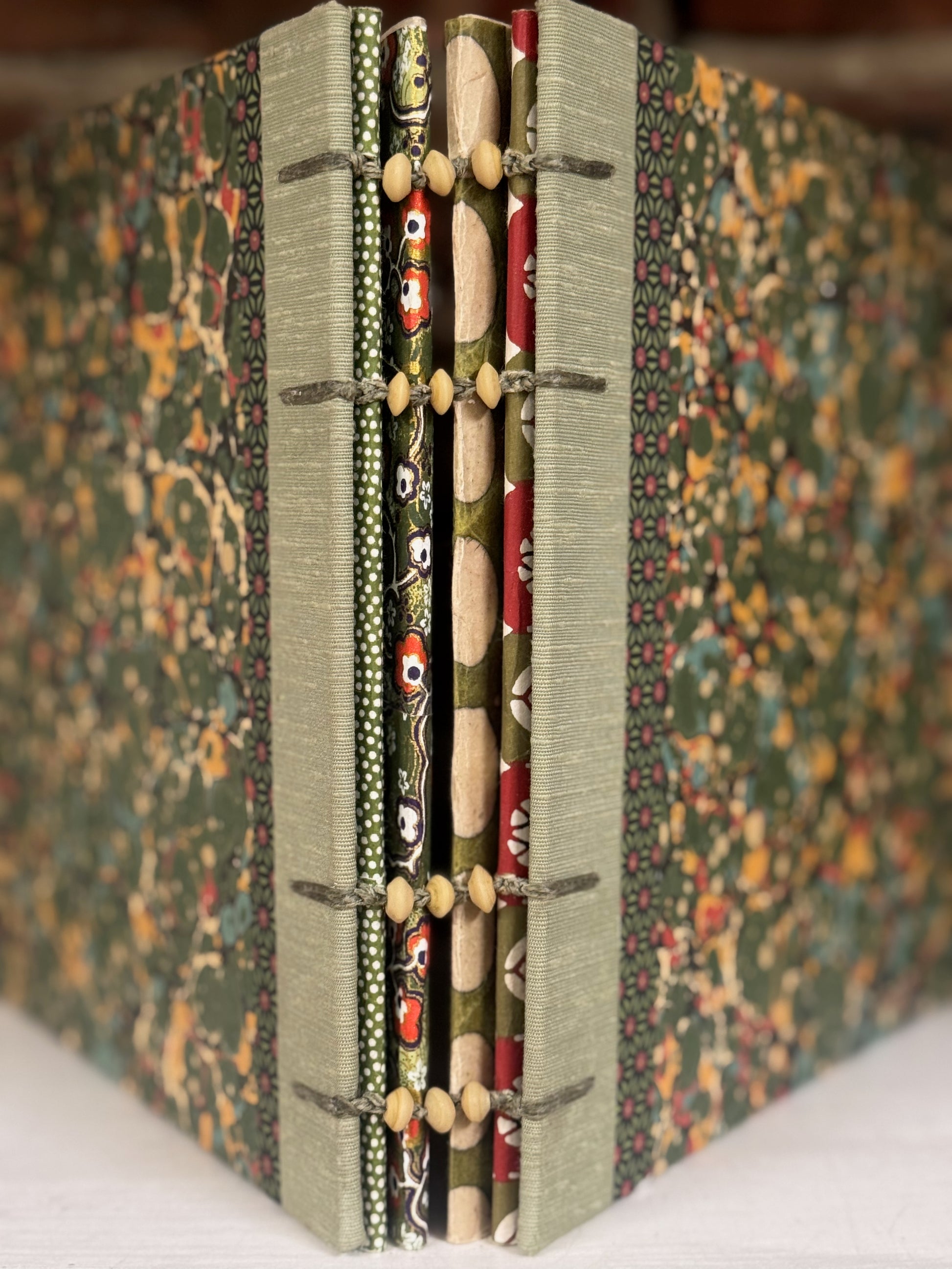 Handbound exposed-spine structure with wood bead accents